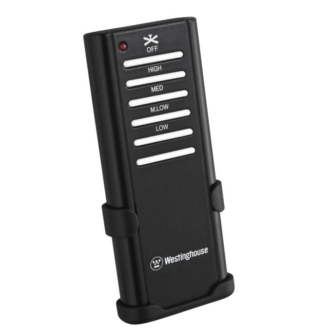 - Ceiling fan with remote control provides easy operation of four fan speeds