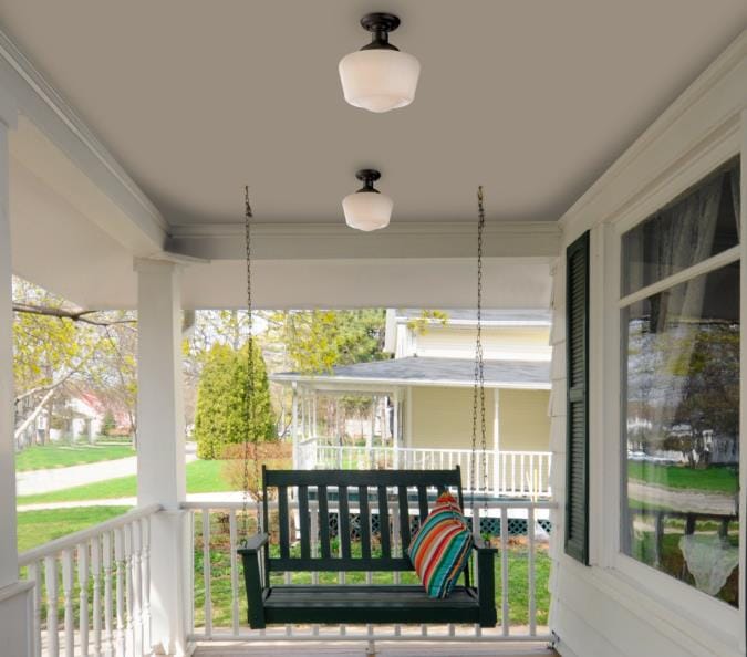 - Semi-flush outdoor light fixture with vintage schoolhouse style, perfect for porches or patios